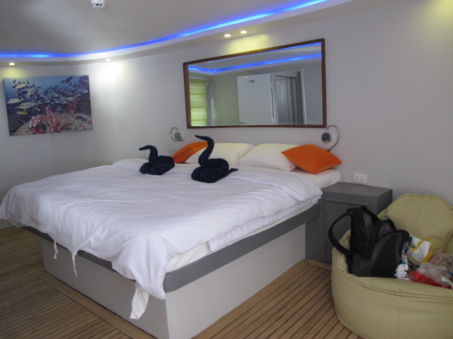 The travelling was effortless; we were picked up on time and arrived at the boat in the afternoon. The boat has had a recent refit and the quality is superb. We all thought it was the best liveaboard we had been on which includes several in the Red Sea and others in the Maldives and Indonesia. The refit had made it more like being in a hotel than a boat. All the cabins are a good size with separate showers rather than wet rooms so the loo rolls don’t get soaking wet. The deluxe cabin is fabulous with a huge bed, TV and lovely mood lighting (I was in two minds whether to stay there and forget the diving!).