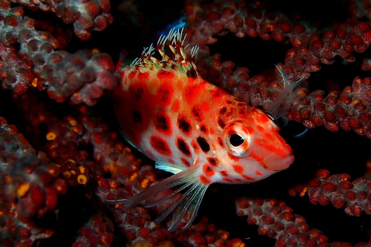 Along the reefs wall of Cabo Douglas and Isabella Island amidst black coral bushes and seafans there were dozens of Long-nosed and Falco hawkfish. Now anyone who has ever tried to take a photo of the long-nosed variety will know they are tricky little critters who like to hop and hover about, flitting off just as you got the focus set. But not so with the ones seen in the Galapagos. Perhaps they were unused to divers and flash photography but they seemed happy enough to hang about and pose for me. I experienced the same action again at Cousin’s Rock where 3 of the Falco variety happily stayed in place, turning occasionally to give me a different angle – how very obliging!