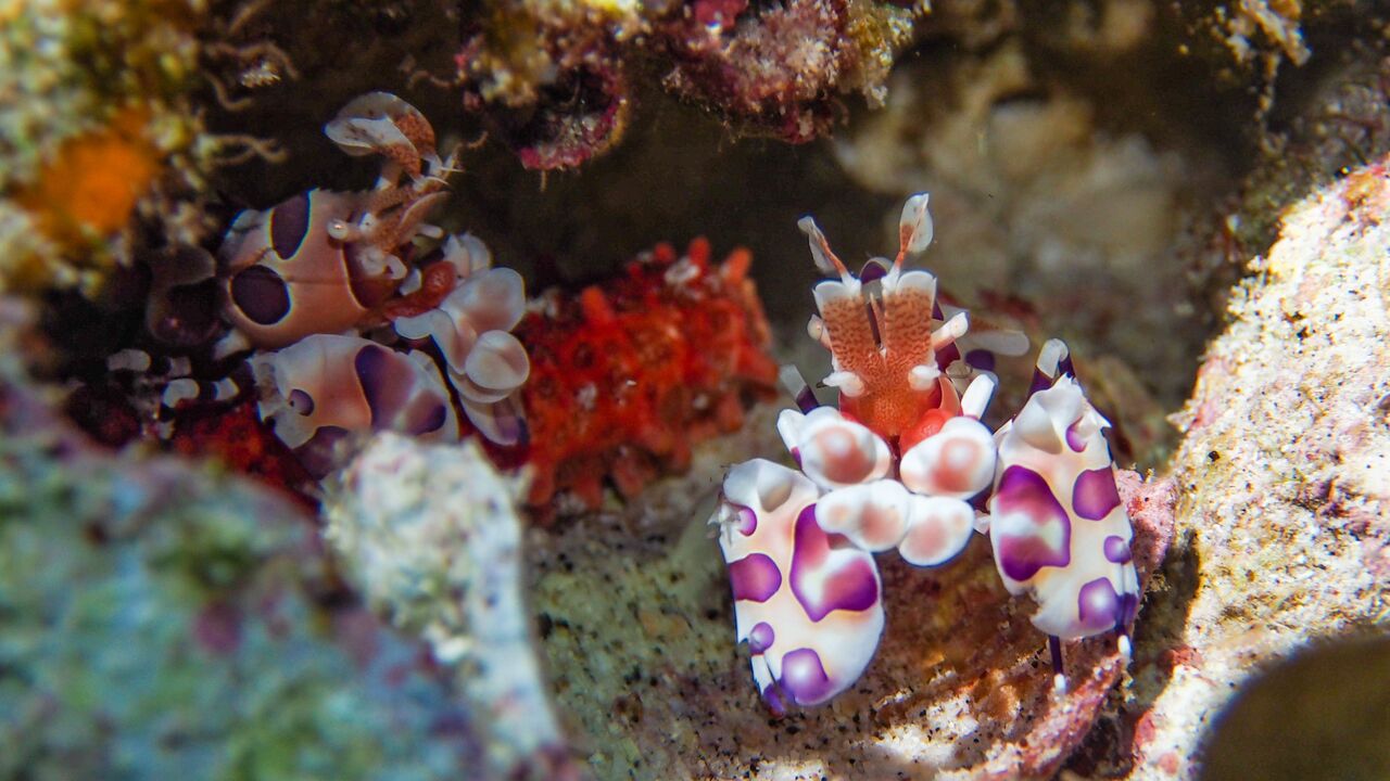 Red rock crabs could be found scurrying over the rocks at almost every dive site and were easy to photograph both in and out of the water. But it was during our batfish hunting dive that I managed to spot a tiny shrimp exhibiting symbiosis with its seastar host – admittedly my photo is pretty bad but i was happy to find it in any case. Though the most surprising find was whilst drifting over the sandy reef at Darwin’s Arch. Our guide, JC, spotted two Harlequin shrimp busy tackling their seastar meal. This was totally unexpected; I’ve only seen a few harlies in the Philippines so was in no way anticipating finding any in the Galapagos. I think JC was as surprised as we were!