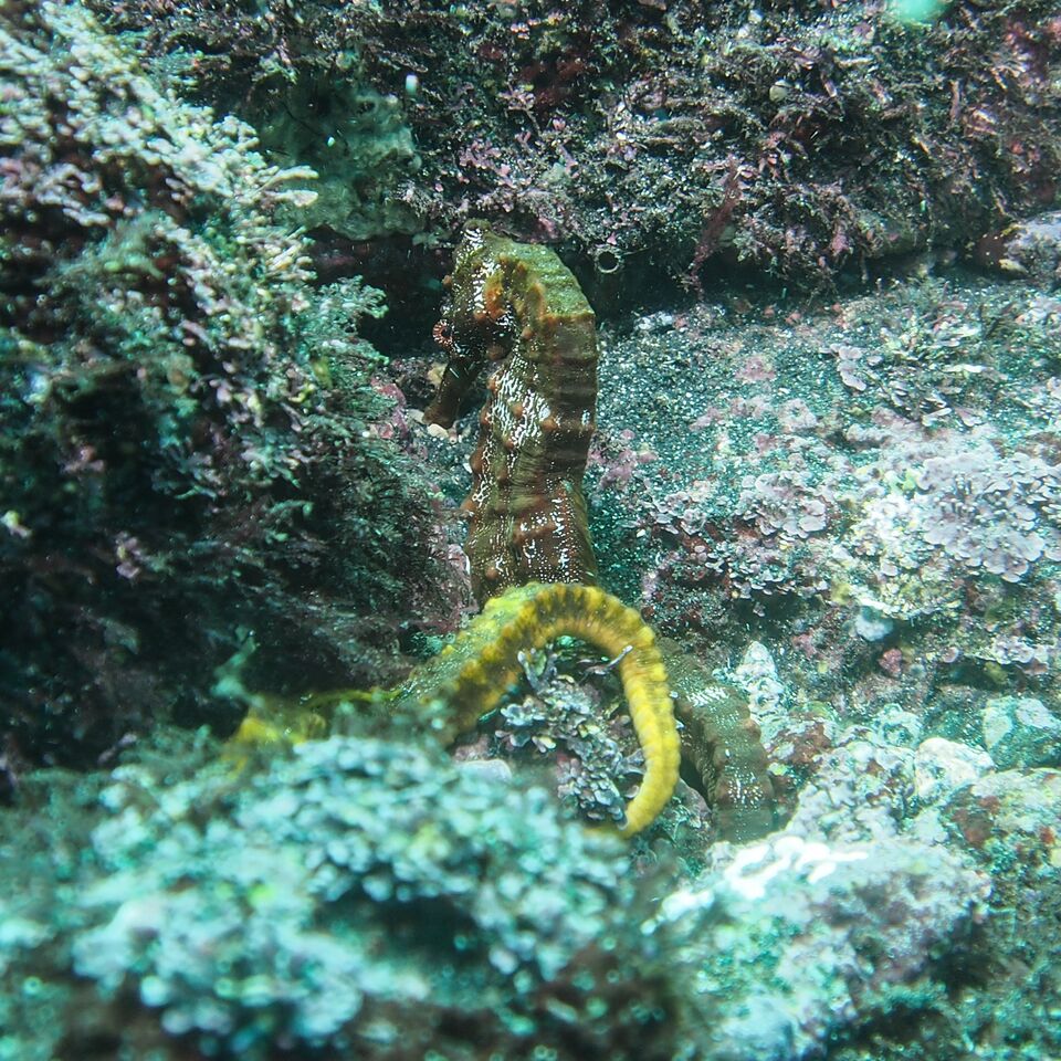 I read about the possibility of seahorses on the Galapagos Master itinerary, so upon arrival at Cabo Douglas we asked about the opportunity to look for these critters. The majority of us have seen seahorses of many varieties but for one of our group it was a first time experience. We found 2 curled around a coral frond in the shallow water. These pacific seahorses are far larger than their Indo-Pacific cousins and gigantic when compared to the miniscule pygmy seahorses of Raja Ampat.