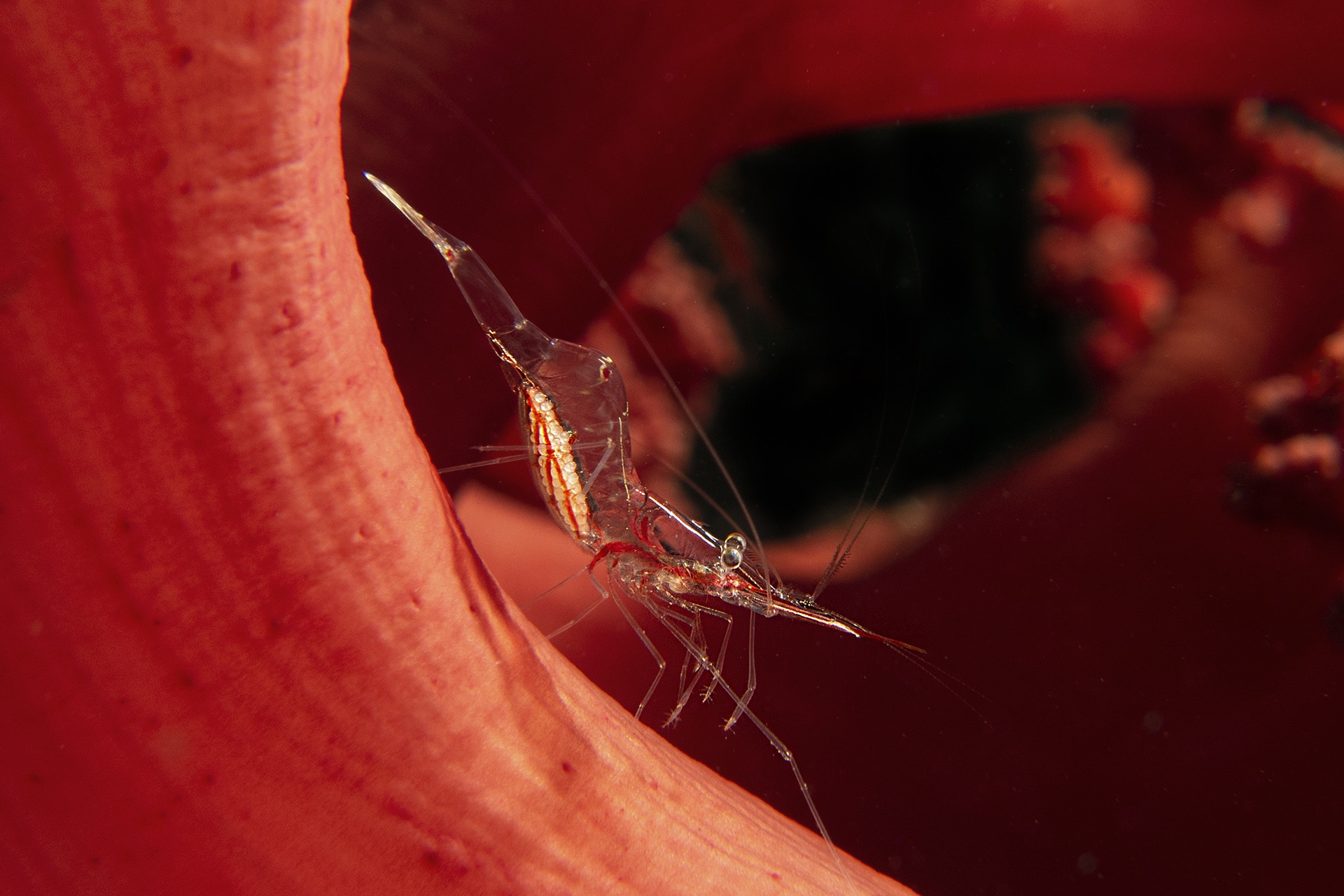 Simple yet stunning. I love the curves of the pink coral leading the eye through to the dark window. The subjects is in sharp focus and framed really well by its environment.