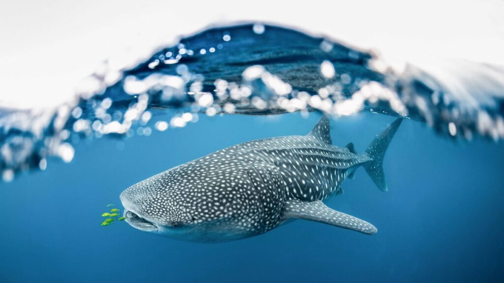 Another stunning split-shot, this time featuring a Whaleshark and it’s yellow pilot fish. This is an eye-catching image that really captures what it was like to be there in that moment. The sparkling water, bright light, and the gentle giant swimming just below the surface. Love this image.