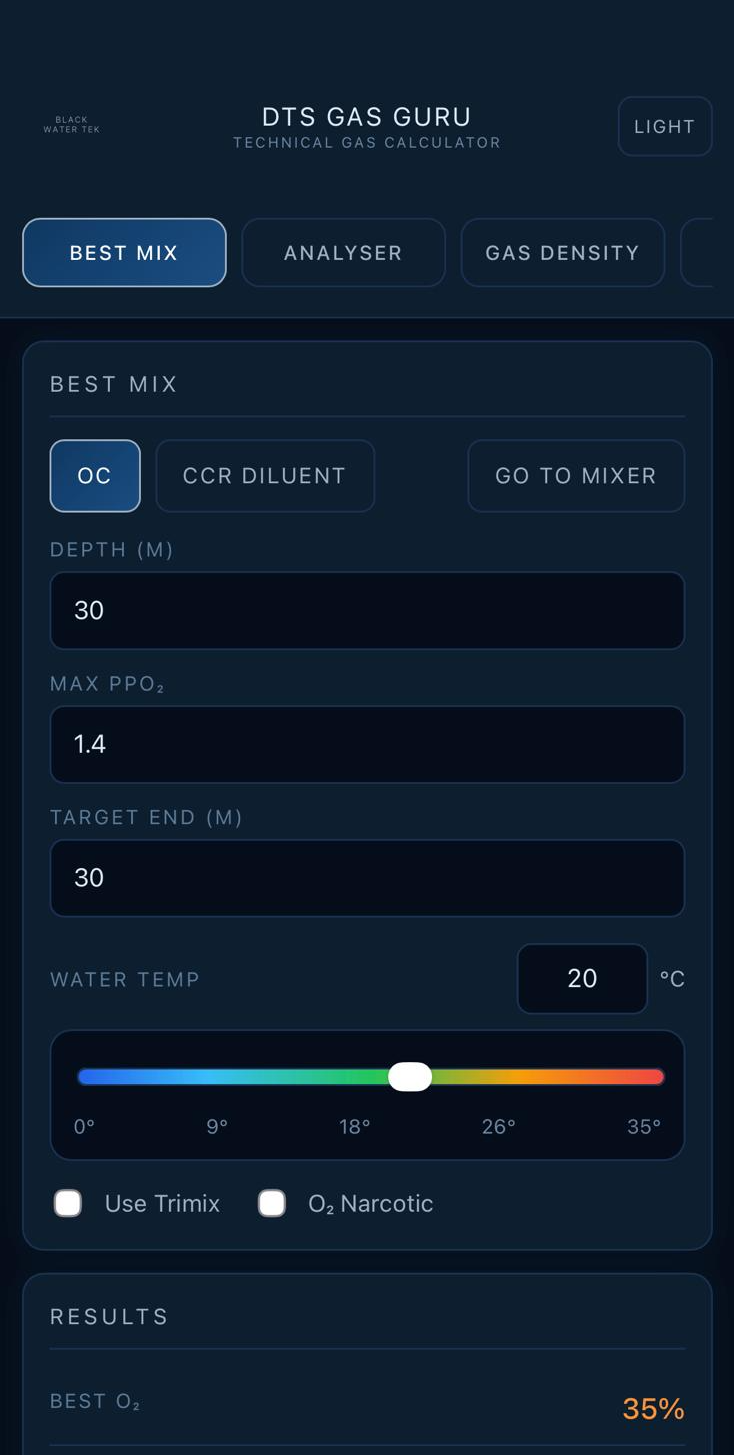 Designed for both open circuit and CCR divers, DTS Gas Guru provides four precision gas tools in a clean, mobile-first interface: