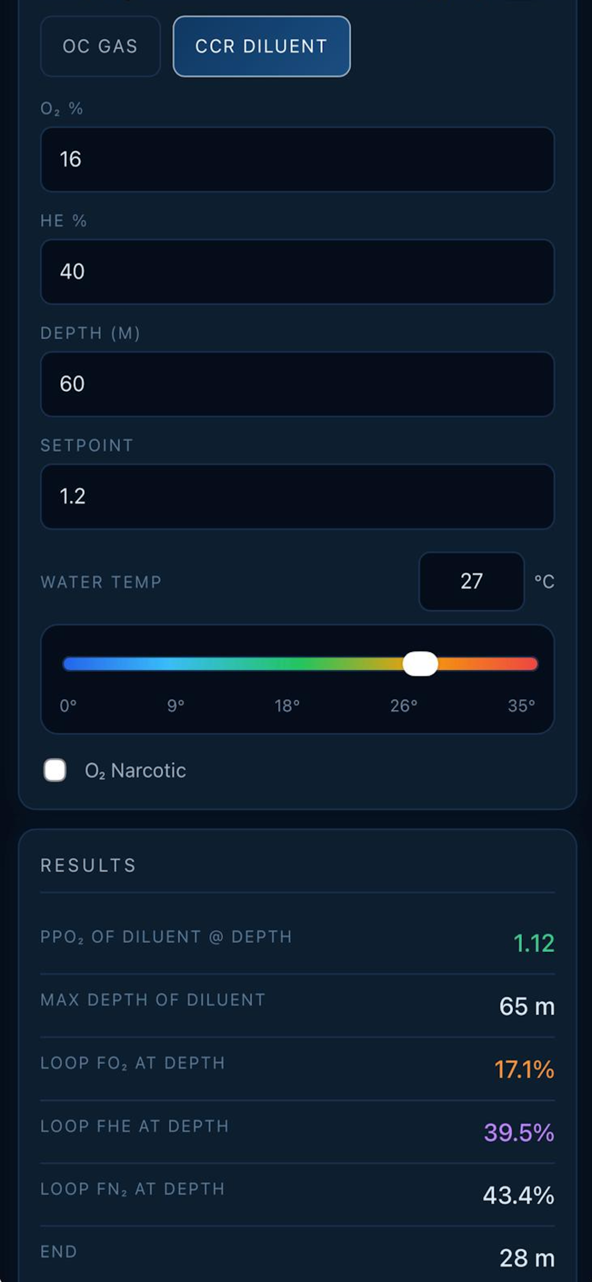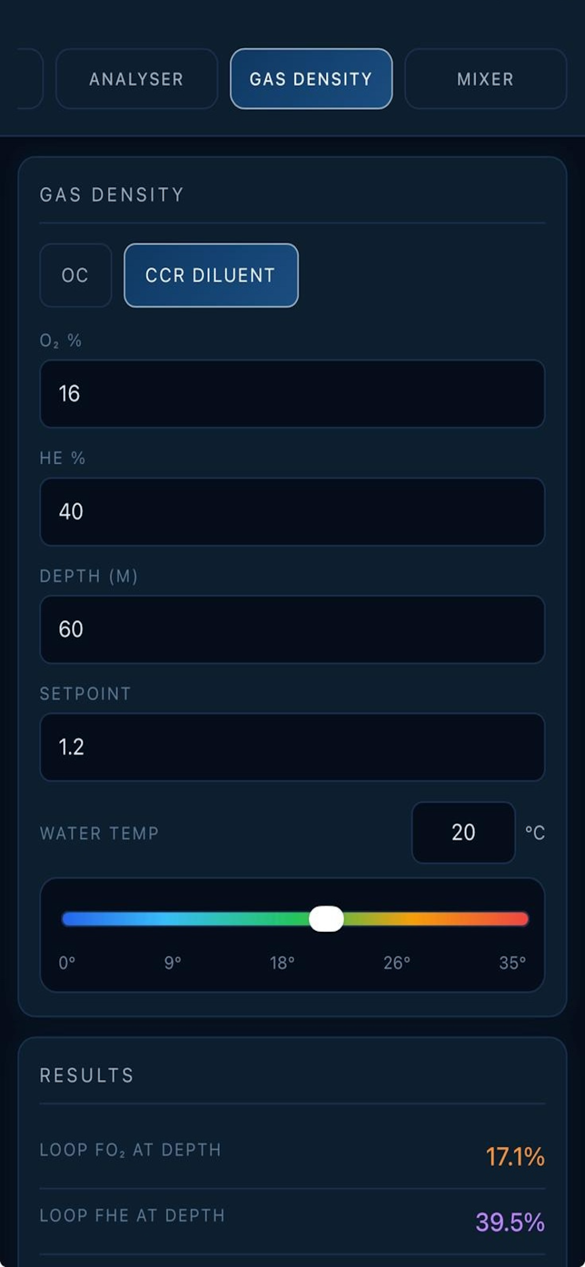 - Gas Density — features a world-first temperature-adjustable density calculator, allowing divers to input actual water temperature for real-time accurate gas density predictions, with colour-coded Safe / Caution / Critical thresholds for both OC and CCR loop gas.