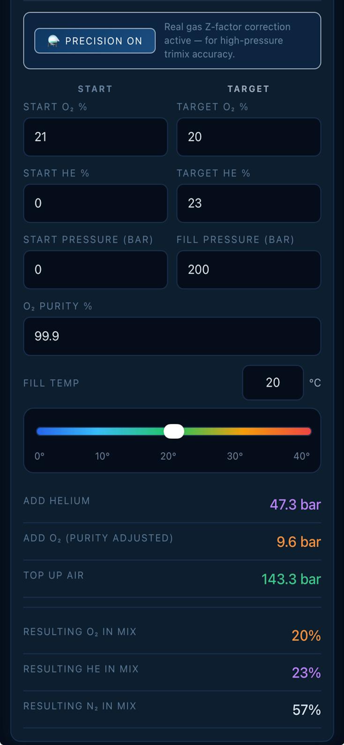 - Gas Mixer — blending calculator for top-up and from-empty fills, with both ideal gas and real gas (Z-factor) precision modes; uniquely allows O₂ purity adjustment to account for real-world cylinder purity, and top-up gas is fully configurable — from air through to any nitrox or trimix blend.