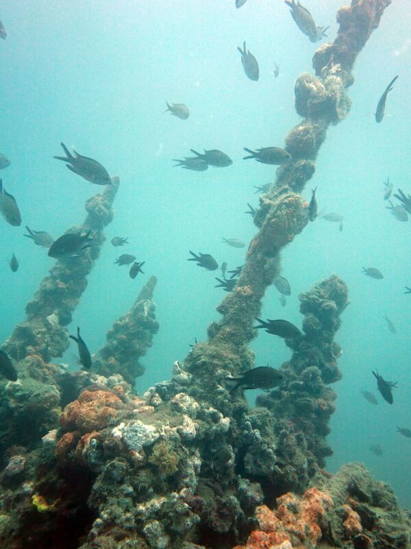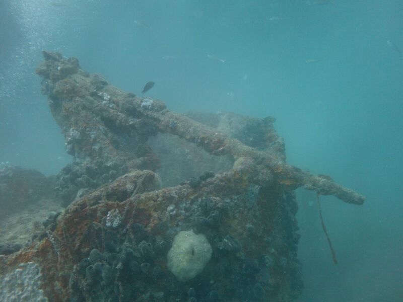 My dive began at the forward end of the mid-ship section. Here the ship is heavily damaged with most of the superstructure missing. Being new to the wreck my buddy and I decided against exploring inside and instead headed aft along the buckled main deck enjoying the shoals of small fish darting in and out of the ship’s broken deck plates.