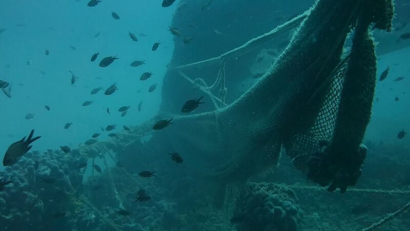My dive began on the main deck roughly half way between the wrecked forward hold and the remains of the superstructure from where I headed aft. The journey took me past the remains of her superstructure eerily draped in trawl nets and along her side rails covered with hard corals and clumps of bright yellow sponges.