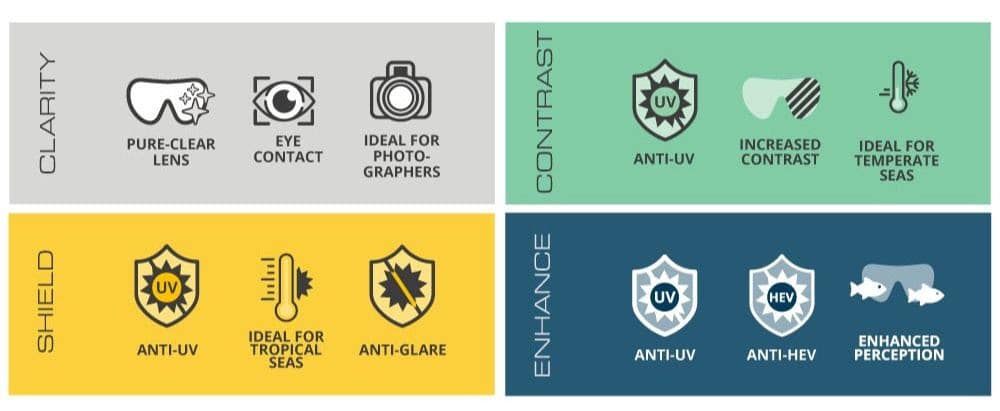 Fourth Element’s lens system in the Scout Dive Mask is designed to deliver an optimised experience for different conditions when diving – whether for underwater photographers looking to maximise the light transmission or wreck divers needing to enhance their perception of dimly lit surroundings.