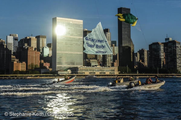 Greenpeace activists flew a giant turtle outside the United Nations headquarters in New York, as countries gathered to begin negotiations, for the first time in history, towards a treaty covering all oceans outside of national borders. The large and colorful kite, representing iconic marine life, was flown from a boat on the East River, alongside an aerial banner reading “Global Oceans – Global Treaty!”
