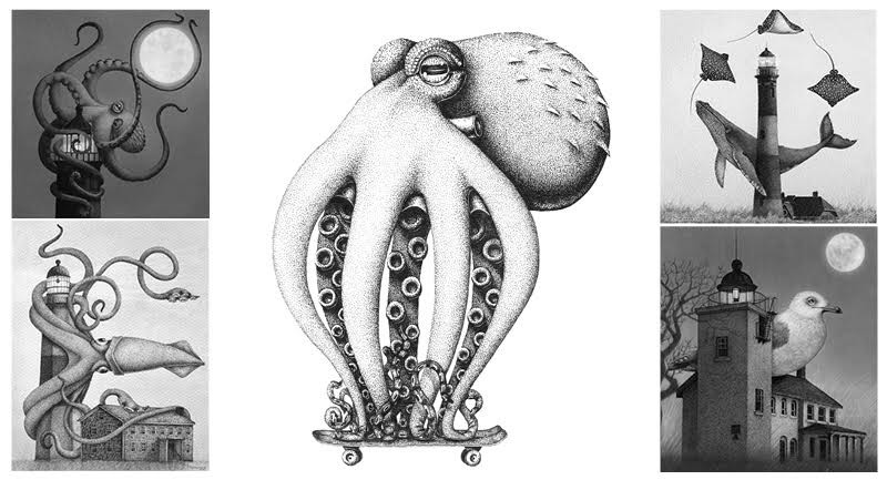 Limited edition fine art prints on archival paper by Artist Juliet Schreckinger. Each one is hand signed, dated, and numbered by Juliet. Print titles as seen in order on the poster: “Oscar’s Lighthouse”, “William and His Lighthouse”, “Oscar”, “The Lightkeepers” and “Horton’s Lighthouse.”