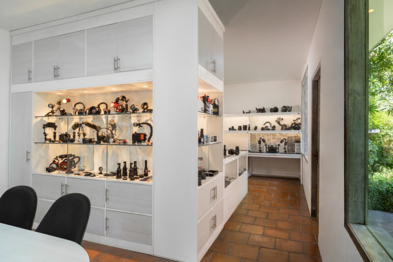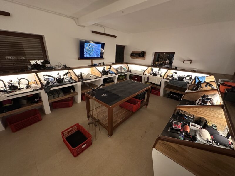 A rinse tank specifically for cameras should be close to the camera room, along with space to store damp housings after dives. Towels are essential, and airguns for drying gear are always a welcome bonus. Little essentials such as cotton buds and a selection of ‘O’ ring grease are also very welcome. Given that most camera rooms are in tropical locations, good ventilation is vital. Humidity is the enemy—especially when damp equipment is being brought in multiple times a day.