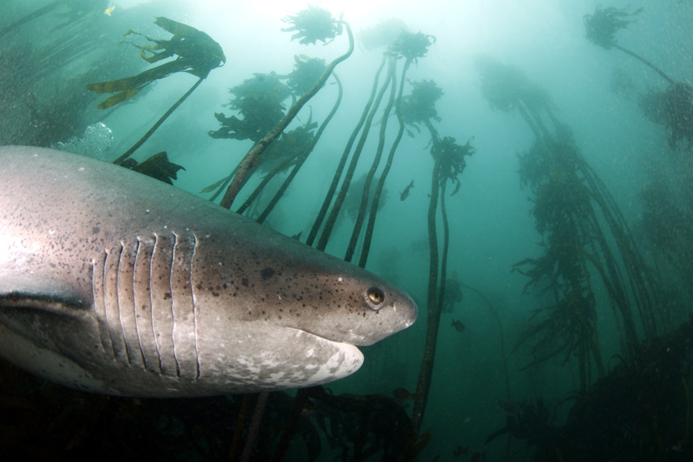 UJ: A picture of the cow shark (seven gill shark) in the kelp forest at Miller’s Point, Simon’s Town, Western Cape, South Africa. It was a challenging dive, coldish water, lots of struggles to pass the kelp with my long strobe arms, 45 minutes with shy sharks, walking sharks and pyjama sharks, but no cow sharks. I had actually given up already. Suddenly this prehistoric shark swam half a meter above my head. This shark was so majestic and calm.