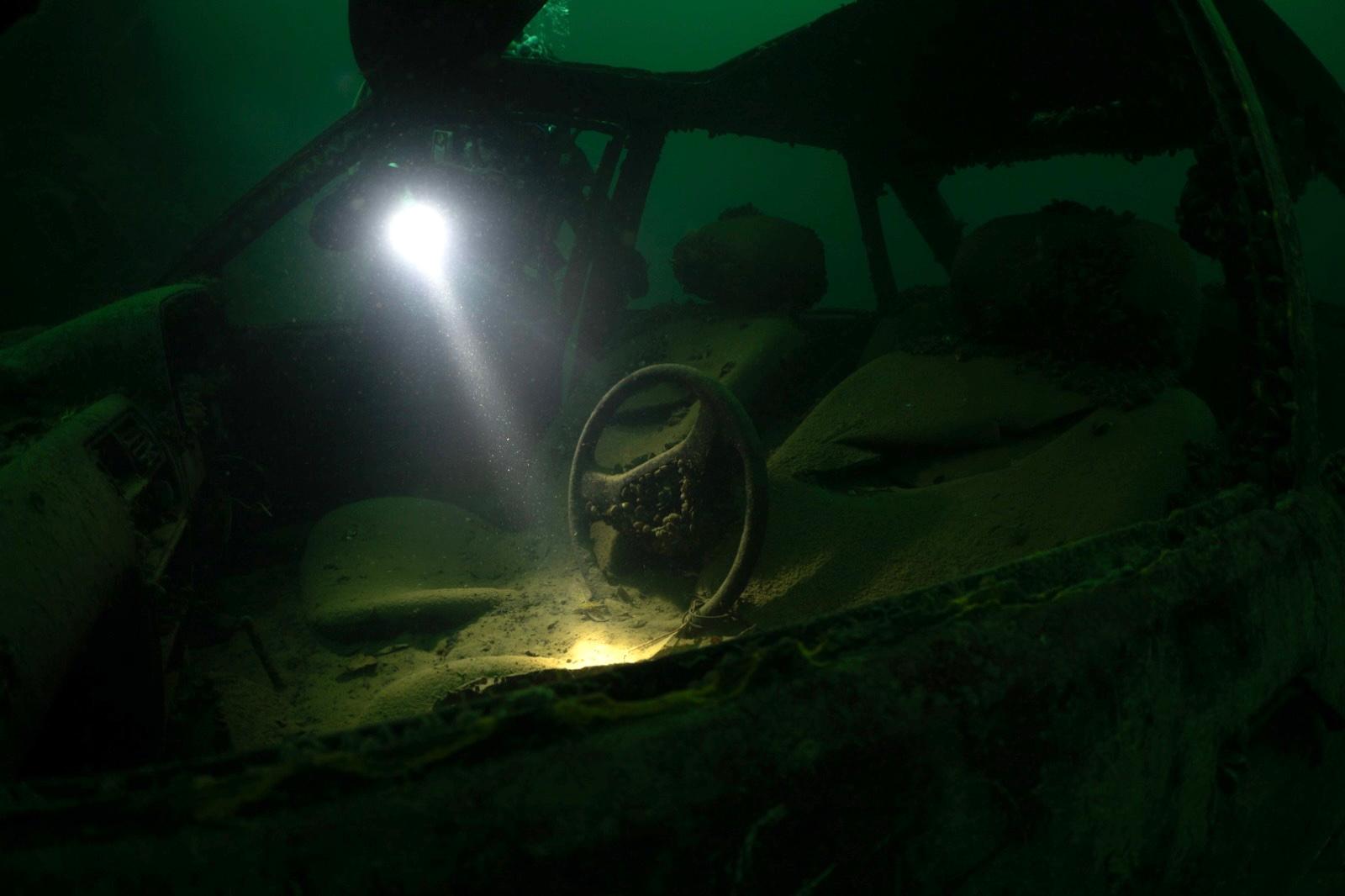 Our second dive took us deeper onto the 22-metre shelf, where we found an old army personnel carrier that you can swim through. This was so much fun! The bottom here was soft mud rather than gravel, and when you reached out your hand, it just kept sinking. It was also our coldest dive yet at 9°C and even with the chill tingling our faces, being dressed appropriately, we stayed toasty warm throughout.